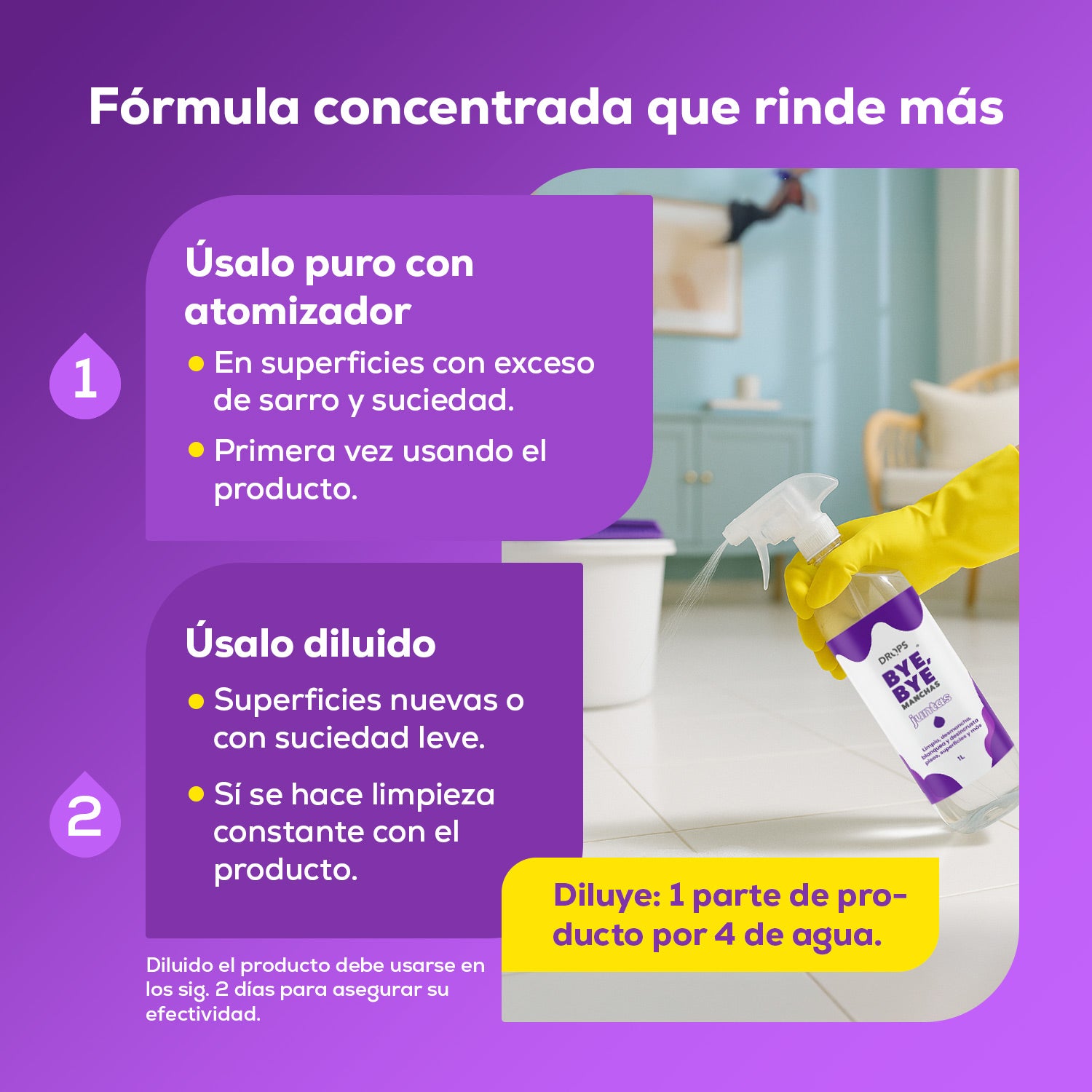 - Usa al 10% para otras superficies es decir 100 ml de Desengrasante con 900 ml de agua.